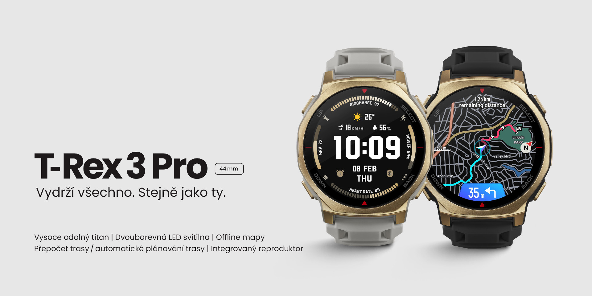 Hodinky T-Rex 3 Pro vydrží všechno, stejně stejně jako ty. Díky odolnosti vojenské třídy, dvojité certifikaci pro potápění, safírovému sklu a AMOLED displeji s jasem až 3 000 nitů, který zůstává skvěle čitelný i na přímém slunečním světle, zvládnou každé dobrodružství. Titanový rámeček z vysoce pevné slitiny dělá z hodinek skvělého parťáka pro všechny outdoorové aktivity.